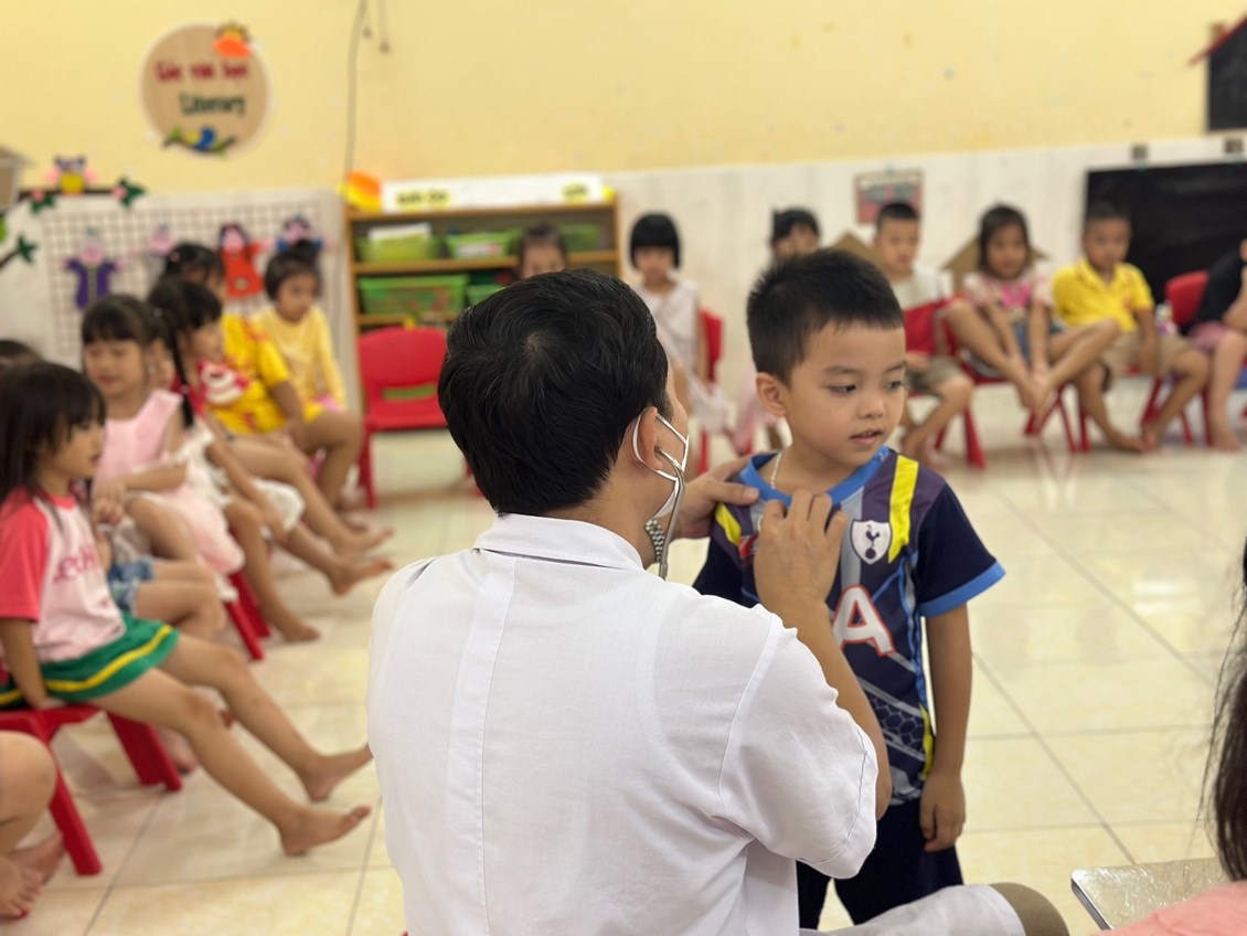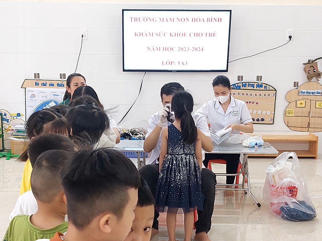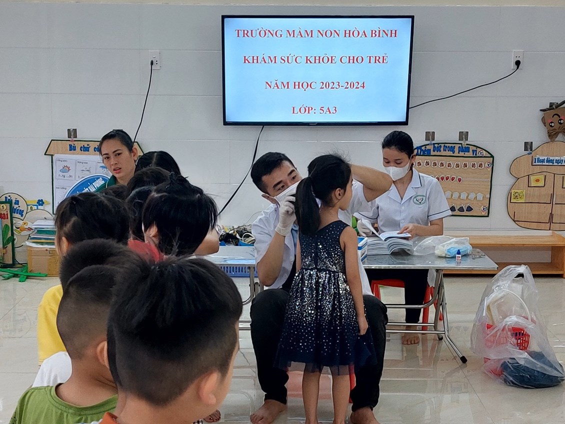 Sáng ngày 14/09/2023 Trường Mầm non Hoà Bình phối hợp với Phòng khám đa khoa Vạn Phúc tổ chức khám sức khỏe định kỳ cho 100% các cháu trong nhà trường với các nội dung kiểm tra: Cân nặng, chiều cao, khám tai, mắt, mũi, họng, kiểm tra tim phổi và một số bệnh liên quan đến đường hô hấp, da liễu ...