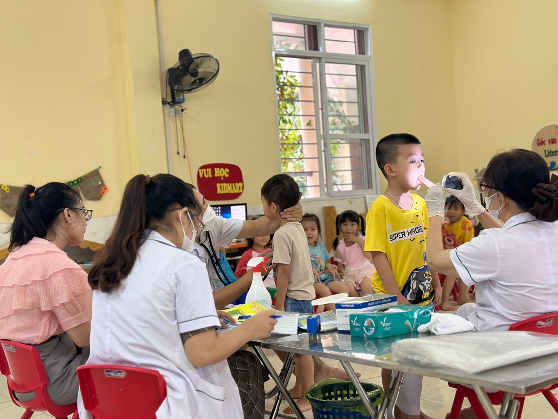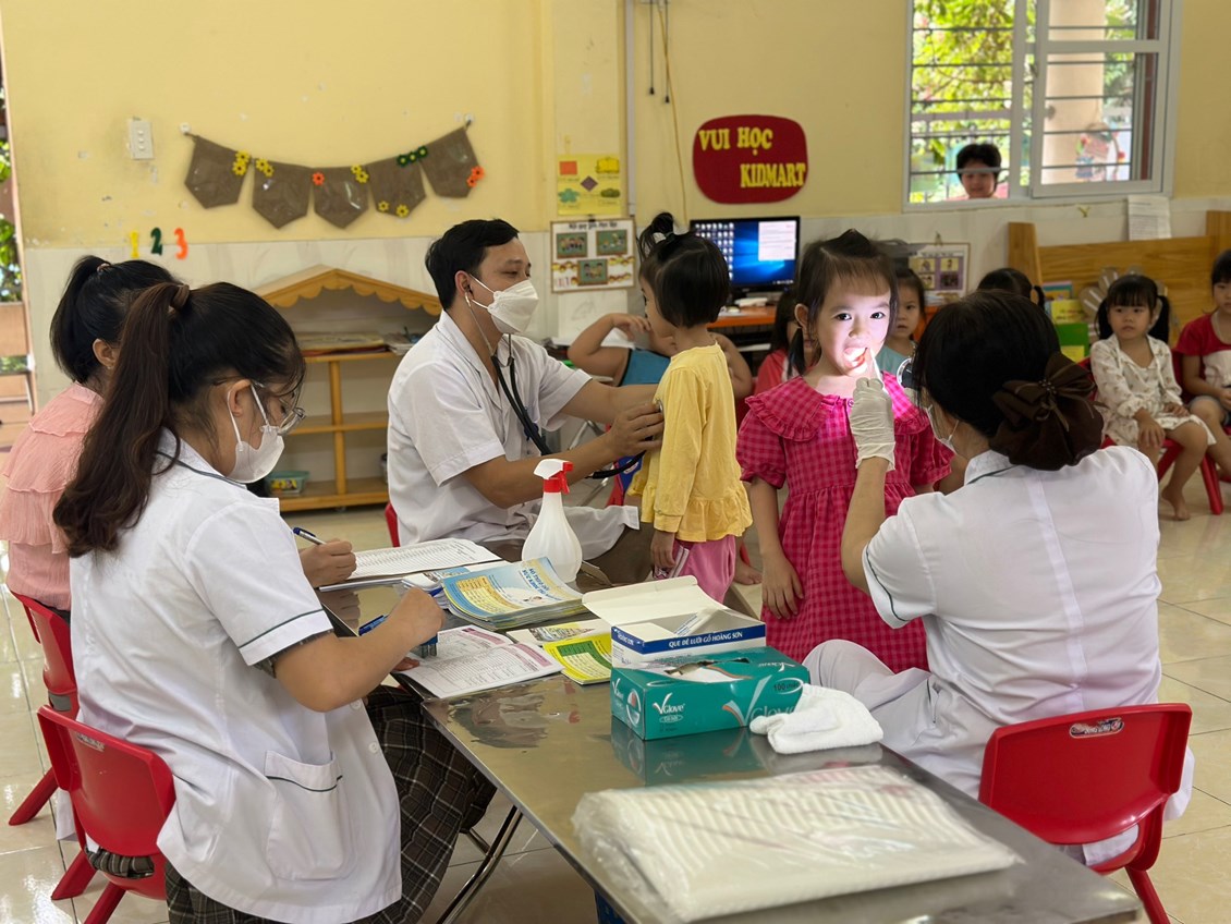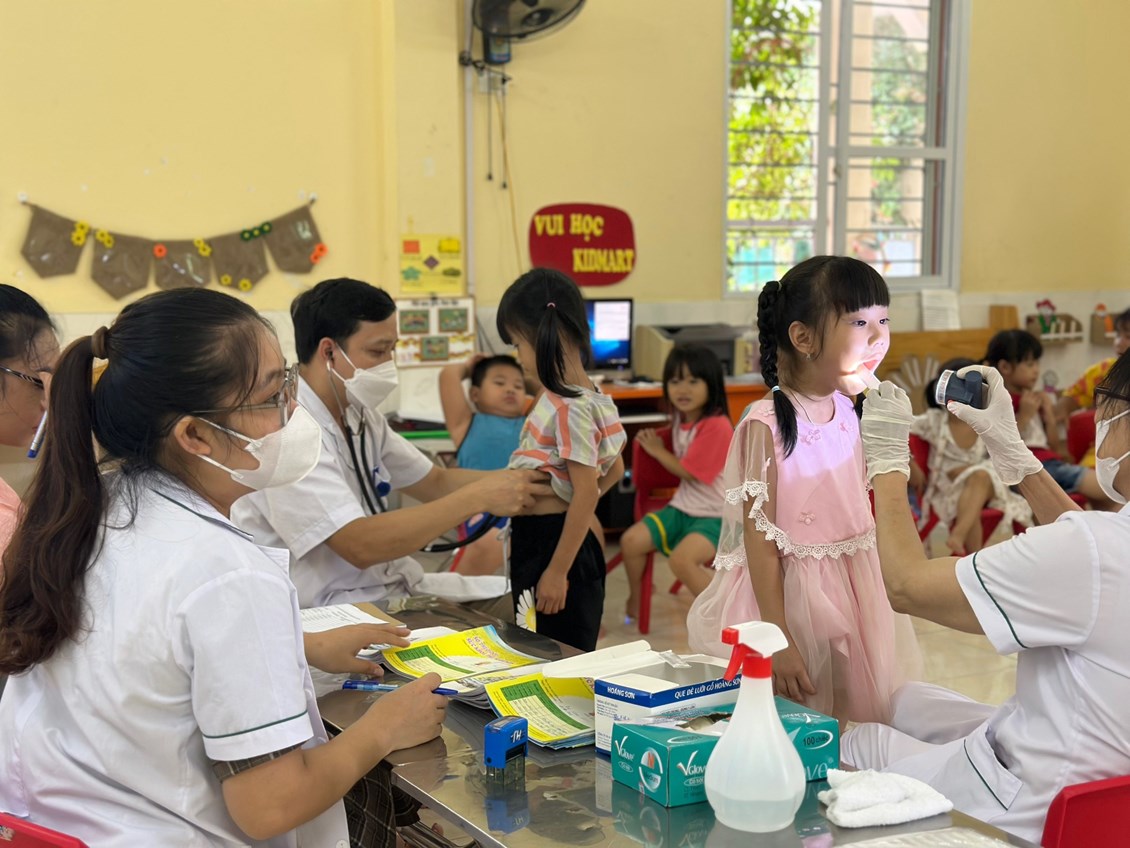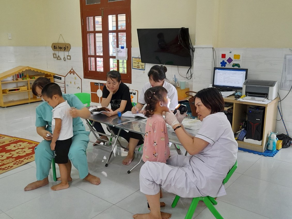 Sáng ngày 14/09/2023 Trường Mầm non Hoà Bình phối hợp với Phòng khám đa khoa Vạn Phúc tổ chức khám sức khỏe định kỳ cho 100% các cháu trong nhà trường với các nội dung kiểm tra: Cân nặng, chiều cao, khám tai, mắt, mũi, họng, kiểm tra tim phổi và một số bệnh liên quan đến đường hô hấp, da liễu ...